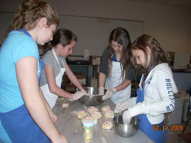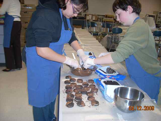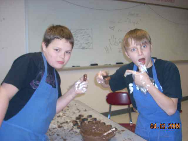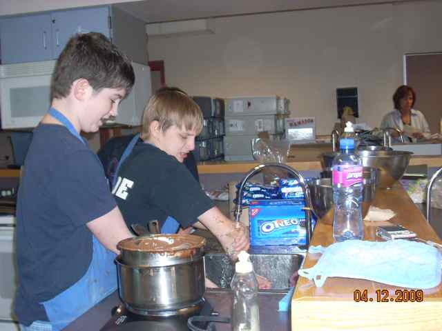 | Pia D. and Michael F. making Cow Pies to sell at a bake sale.  | Rebecca T., Allison R., Morganne H., and Amy M. make "haystacks" for the bake sale.  | Ian T. and Justin L. clean up.  | Ian and Justin taste test the results!  |