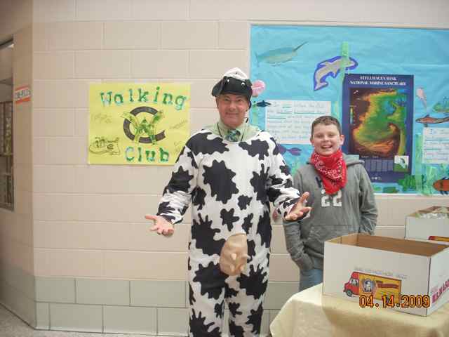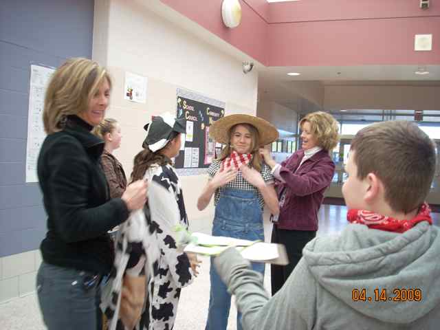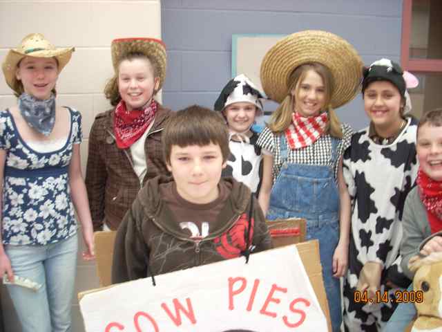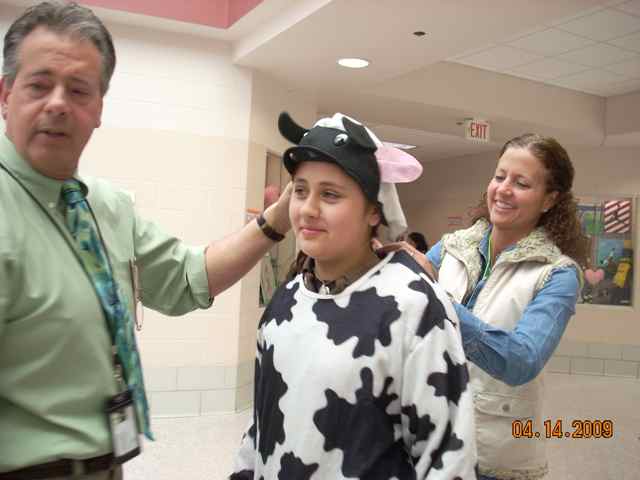 | Mr. Stempleski gets "into" the cow theme, urged on by Danny N.  | Enthusiastic students selling cow pies include: Lily P., Jacqui W., Gordon F., Kayla C., Riley C.,  Dani M., and Danny N.  | Ms. Kelly organizes the sales with Dani M., Riley C., Ms. Lybarger, and Danny N.  | Mr. Stempleski helps Dani M. with her cow costume along with her mom.  |
